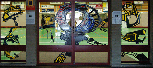 Een tweetal kunstobjecten waaronder een handgeschilderd raam in de deurpanelen (vitra art) en doorlopend in de foyer een kunstwerk geschilderd op de stenen wand. Deze muurdecoratie is een compound compositie op kunststof basis. Het is een abstract kunstwerk met verschillende kleuren.