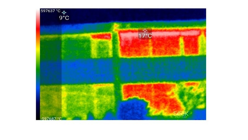 De kleuren geven een temperatuur aan. Donkerblauw is koud, rood-wit warm. Hoe meer blauw hoe beter en rood/wit betekent warmteverlies.