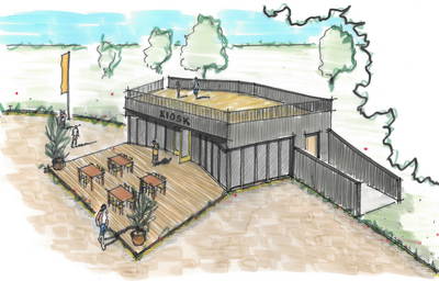 De kiosk komt op een centrale plek, met uitzicht op het strand en het Schateiland. Ouders kunnen vanaf het terras hun kinderen goed in de gaten houden. De kiosk biedt informatie, iets te eten en drinken en sanitaire voorzieningen. Stichting De Baron gaat de kiosk beheren. De schets hieronder is een droombeeld. We werken het plan nog uit binnen het beschikbare budget.