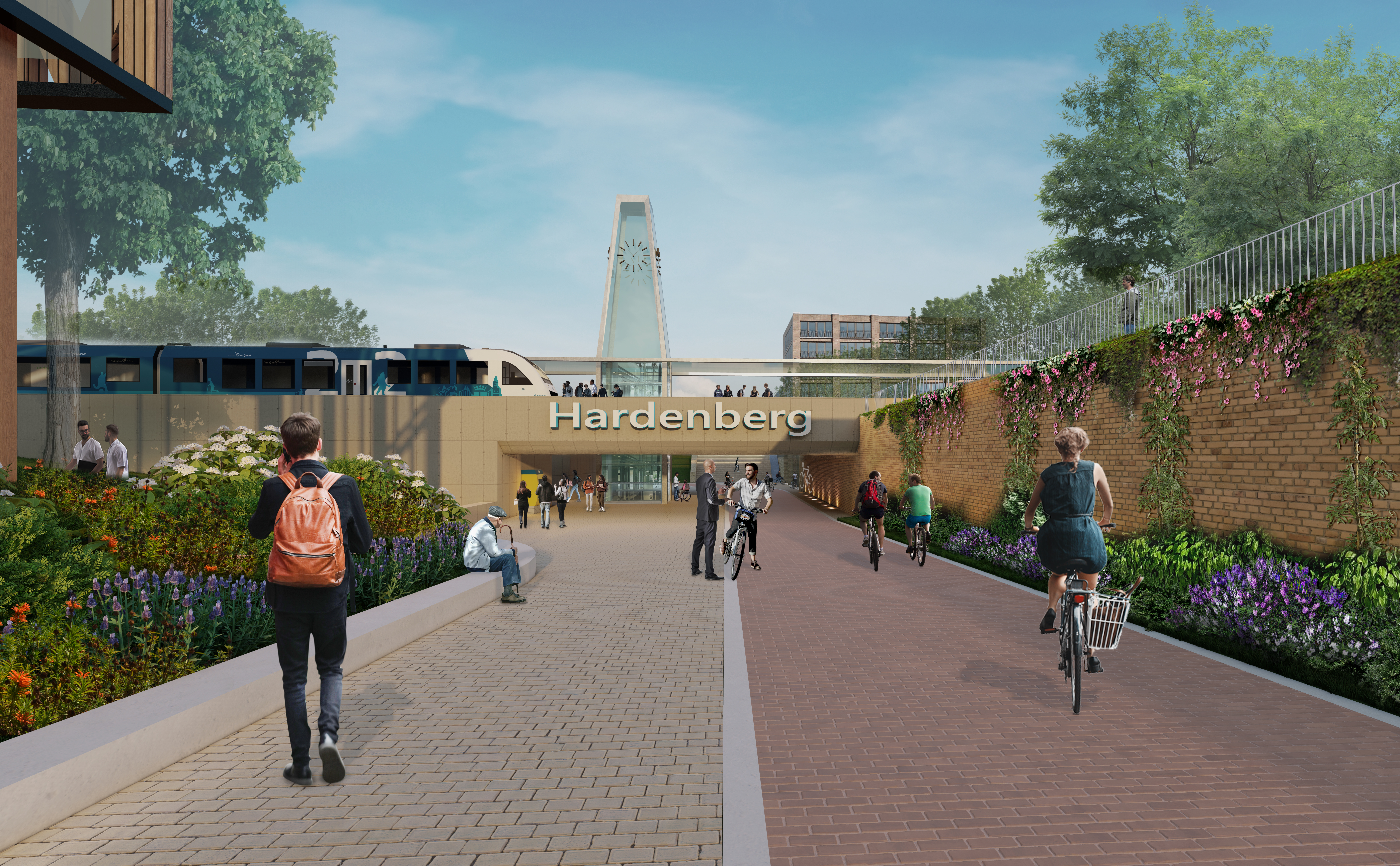 In 2040 is het stationsgebied van Hardenberg een volwaardig onderdeel van het centrum en de entree van de stad. Het is dan niet alleen een plek om de trein te pakken, maar een stadsdeel waar mensen wonen, werken, leren, ontspannen en elkaar ontmoeten. De omgeving is groen, veilig, gezond en levendig.
