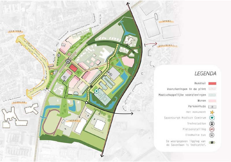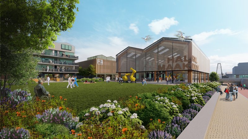 - In het hart van het gebied ligt een nieuw ontmoetingsplein, direct naast het station. Hier is ruimte voor terrassen en evenementen. De MAAKhal, waar onderwijs en bedrijven samenwerken, ligt aan dit plein.