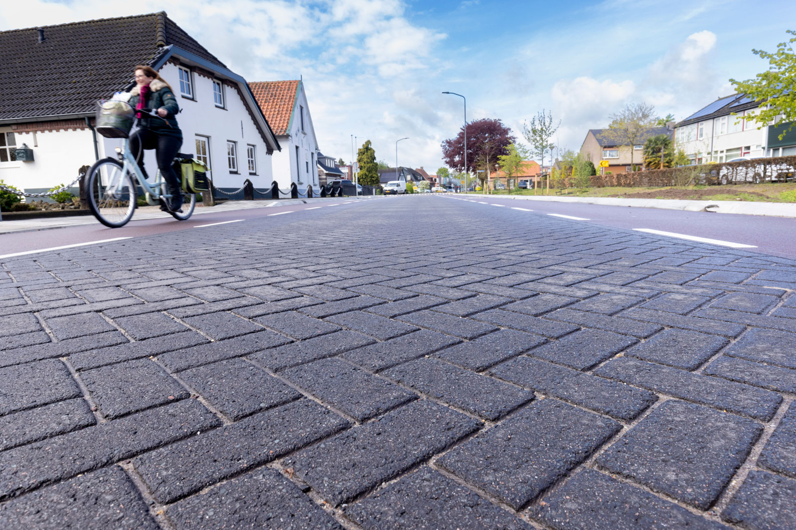 We hoorden dat er vragen zijn over deze streetprint in het asfalt. Daarom leggen we dit graag uit. Asfalt met een klinkermotief maakt iets meer geluid dan glad asfalt, maar is stiller dan een weg met echte klinkers. Door de lagere snelheid neemt het geluid in het gebied af.